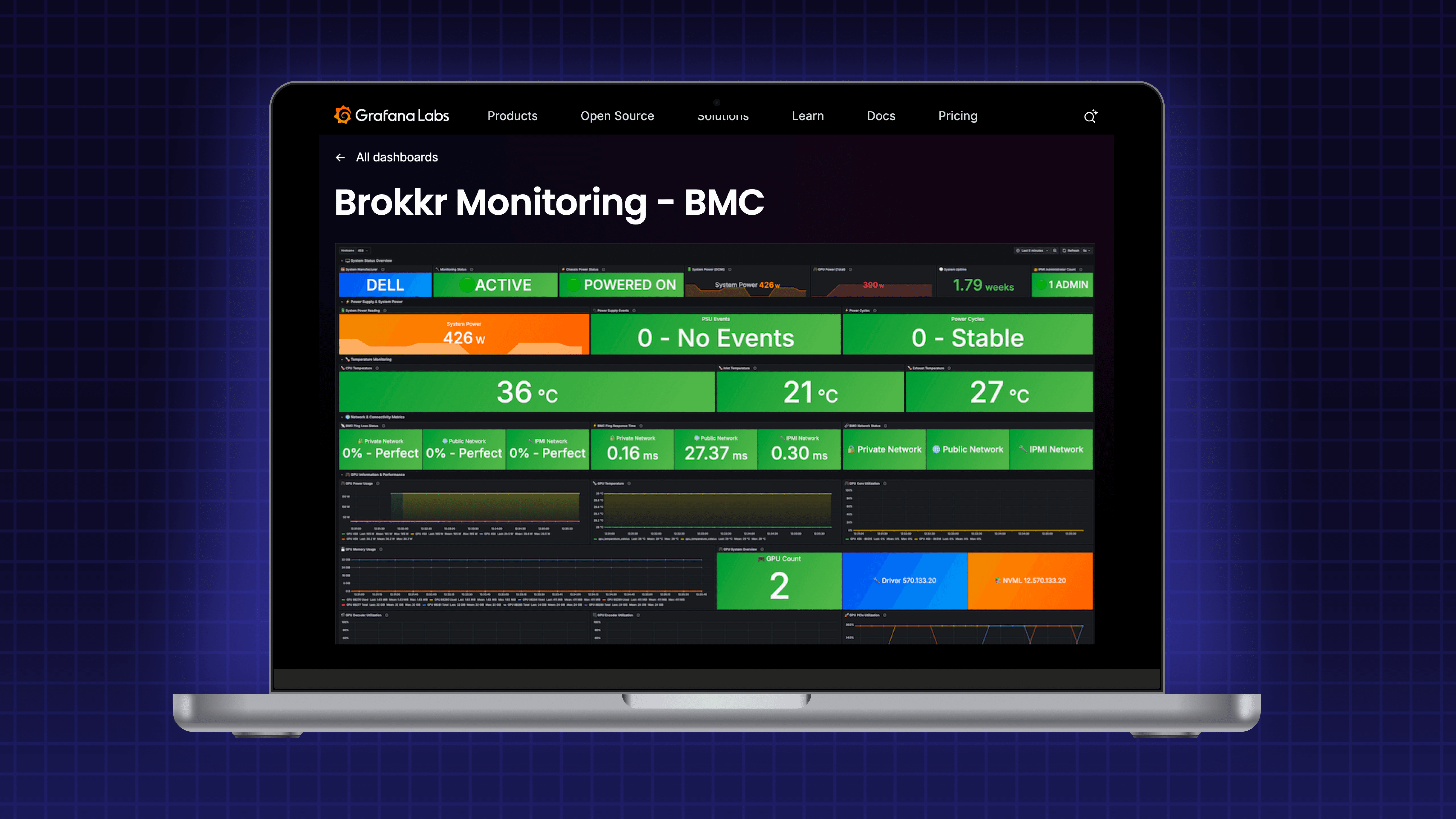 Because the data is native Prometheus, operators can configure alerting using Grafana's built-in alerting engine - setting thresholds for temperature, power, connectivity, or any other metric and routing to PagerDuty, Slack, email, or any webhook. One monitoring layer spans every cluster we manage for you - one view, regardless of data center facility or geography.