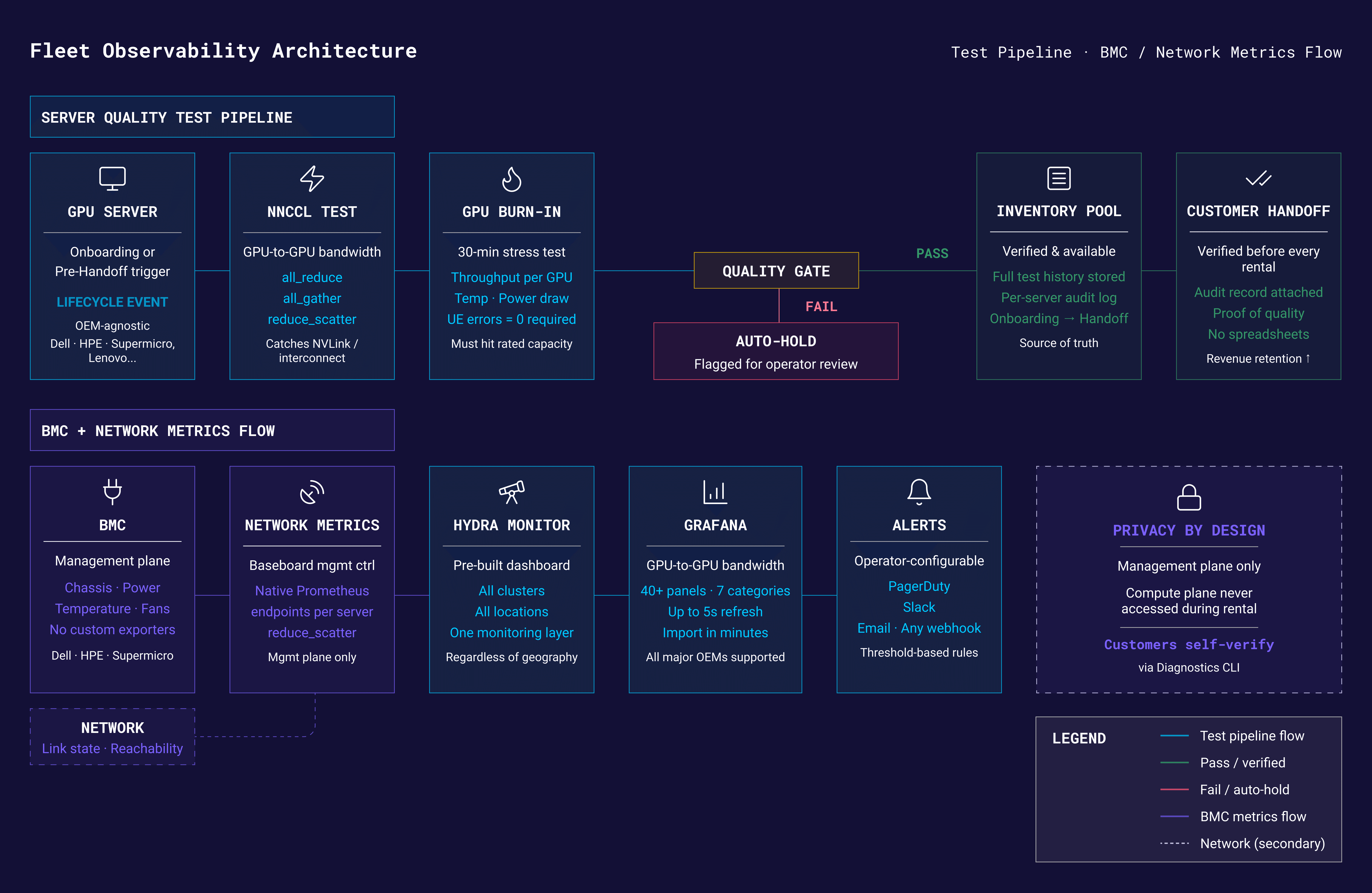 These aren't just operational headaches. Customers running production AI workloads stay with operators who can demonstrate consistent hardware quality. When you can't prove the server was healthy at handoff, and you can't see what's happening across your fleet in real time, you lose the renters who matter most. Fleet observability is a revenue retention concern.