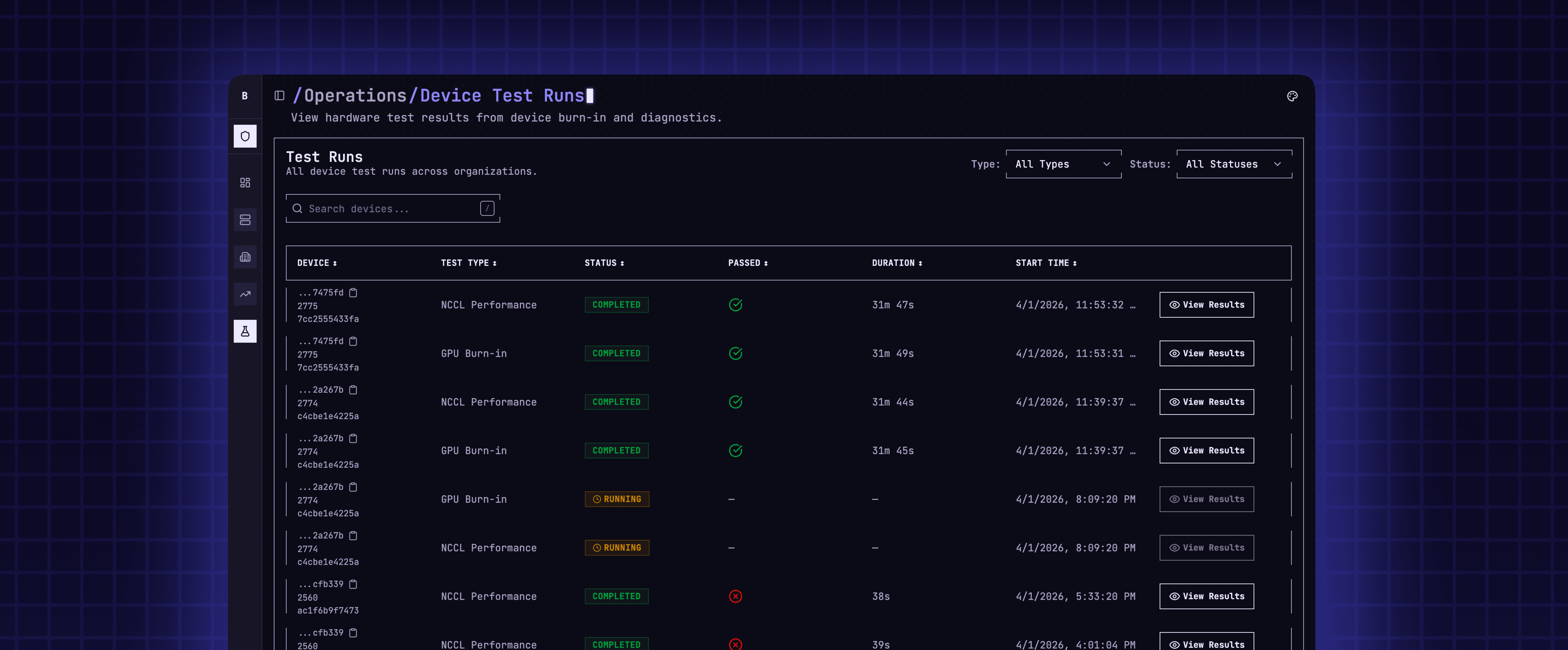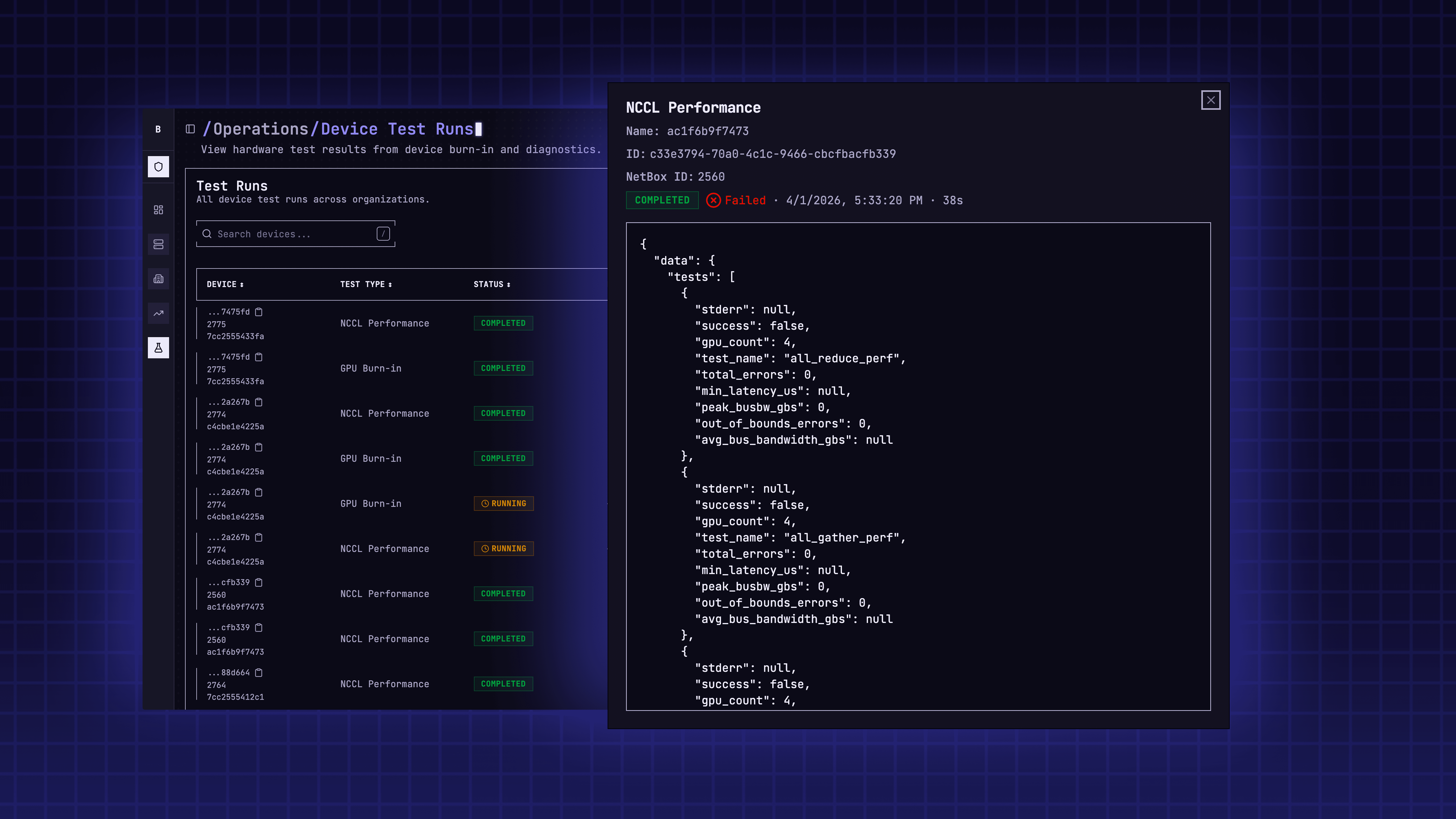 For operators, the day looks different. When a renter reports degraded performance, you pull up the server's test history and show exactly what was validated at handoff - no scrambling, no guesswork. Instead of logging into three different monitoring setups to understand fleet health, one dashboard covers all of it. Servers that fail testing are held back from inventory before they reach a customer, reducing the risk of handing off hardware that isn't ready.