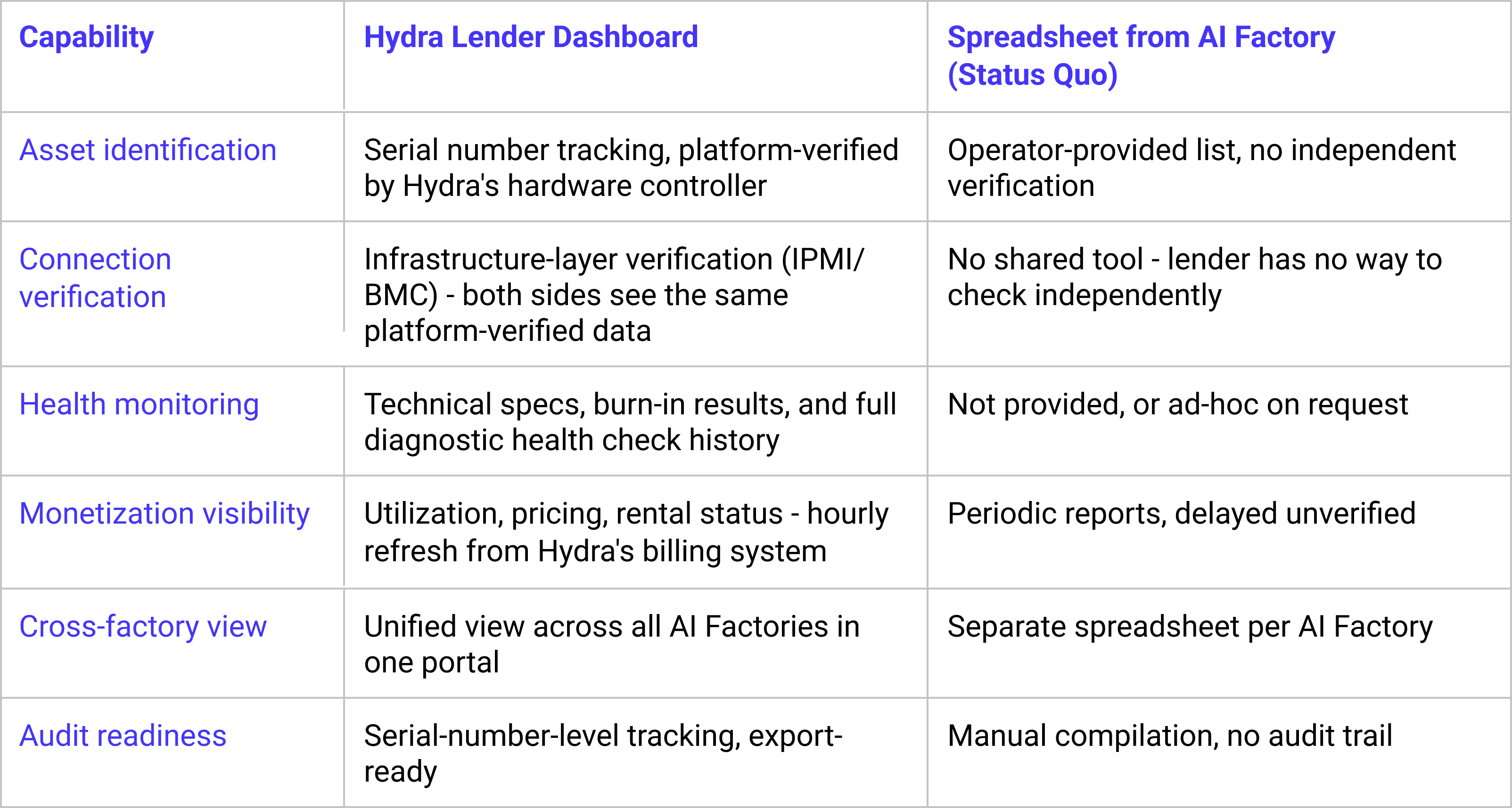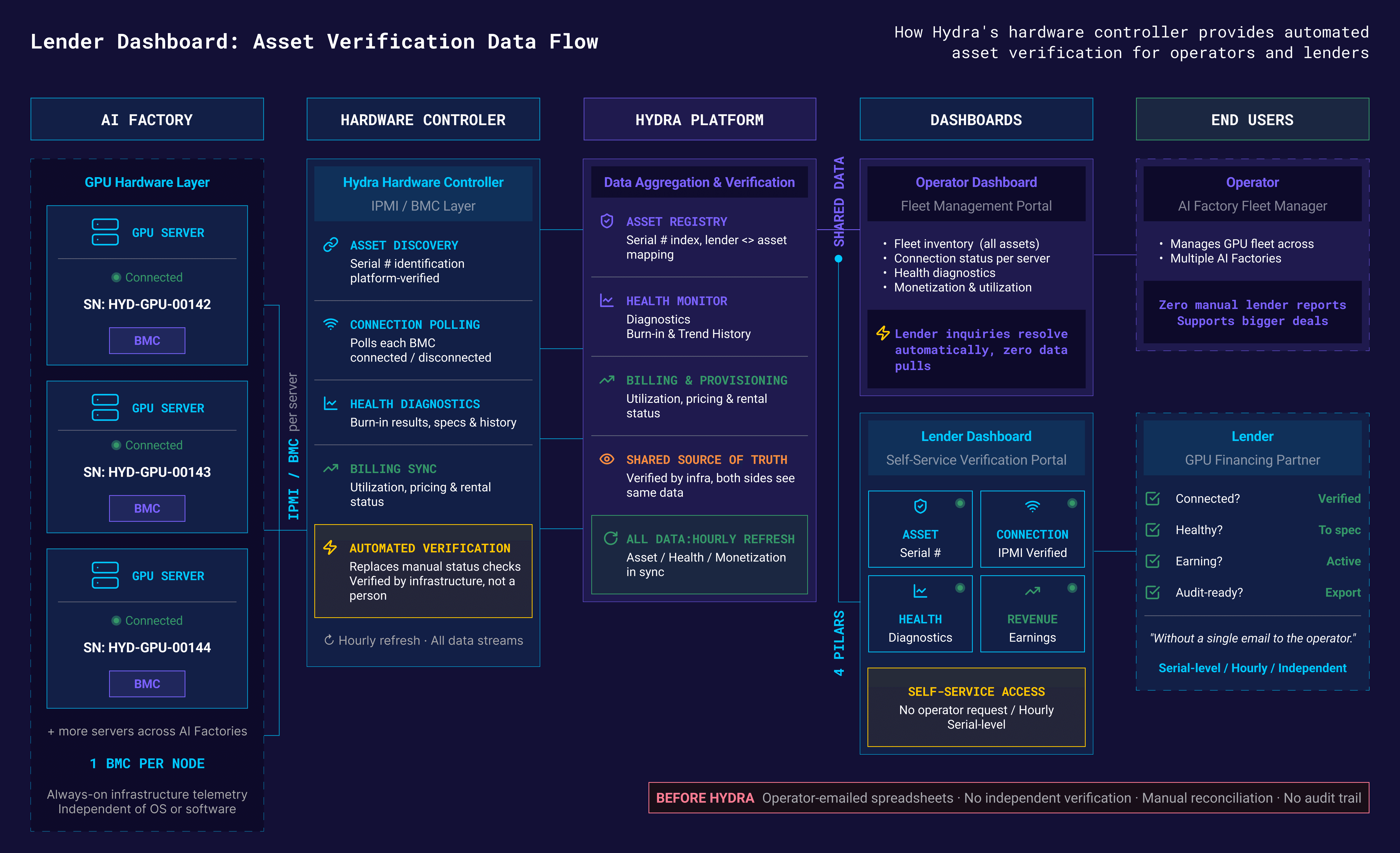 There is no established lender portal for GPU financing today. Both sides have been working around the absence of shared tooling - operators lack an efficient way to share verified data, and lenders lack tools to access it independently. The Lender Dashboard is the first purpose-built portal that gives both parties infrastructure-verified asset data direct from Hydra's hardware controller.
