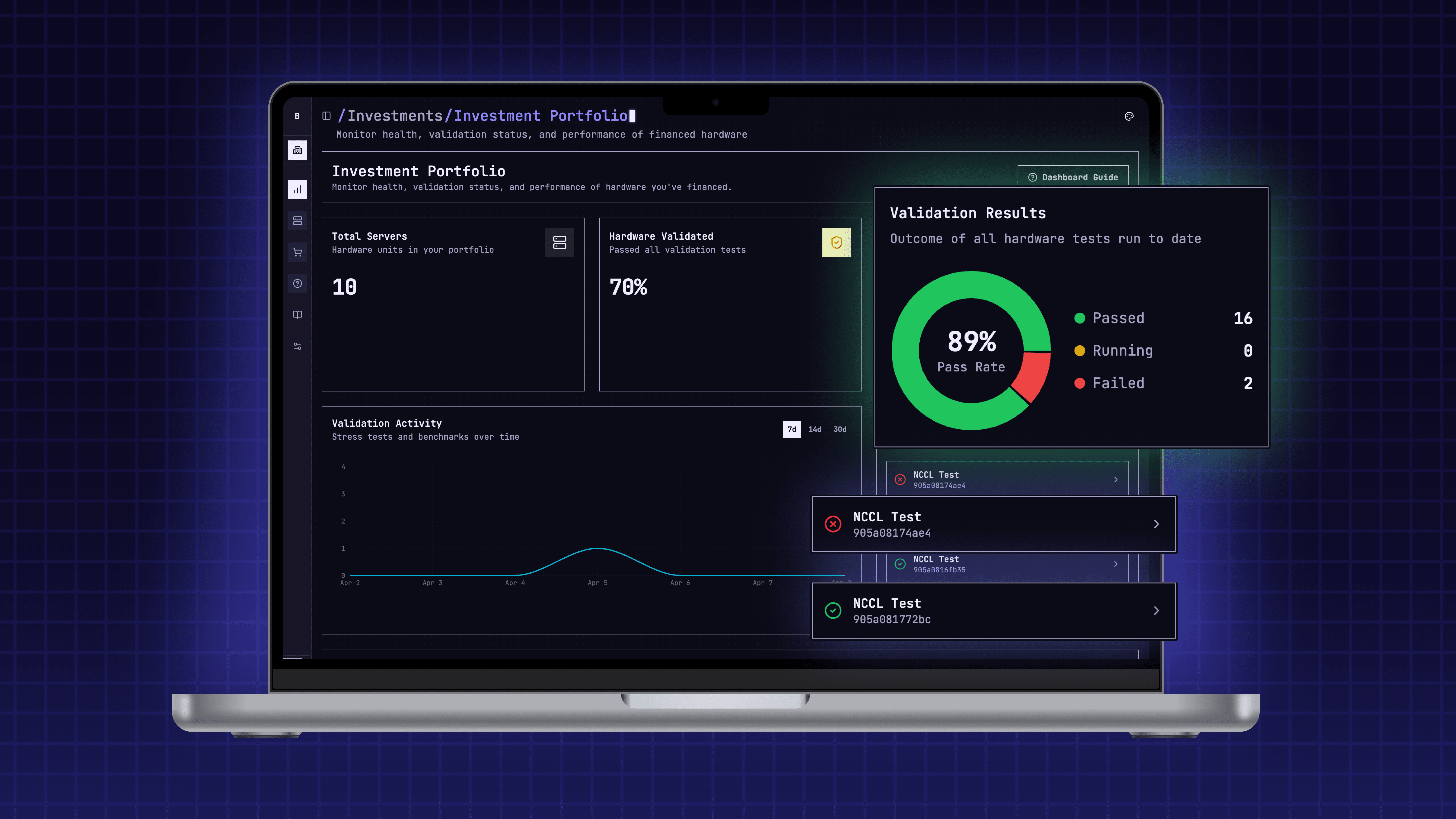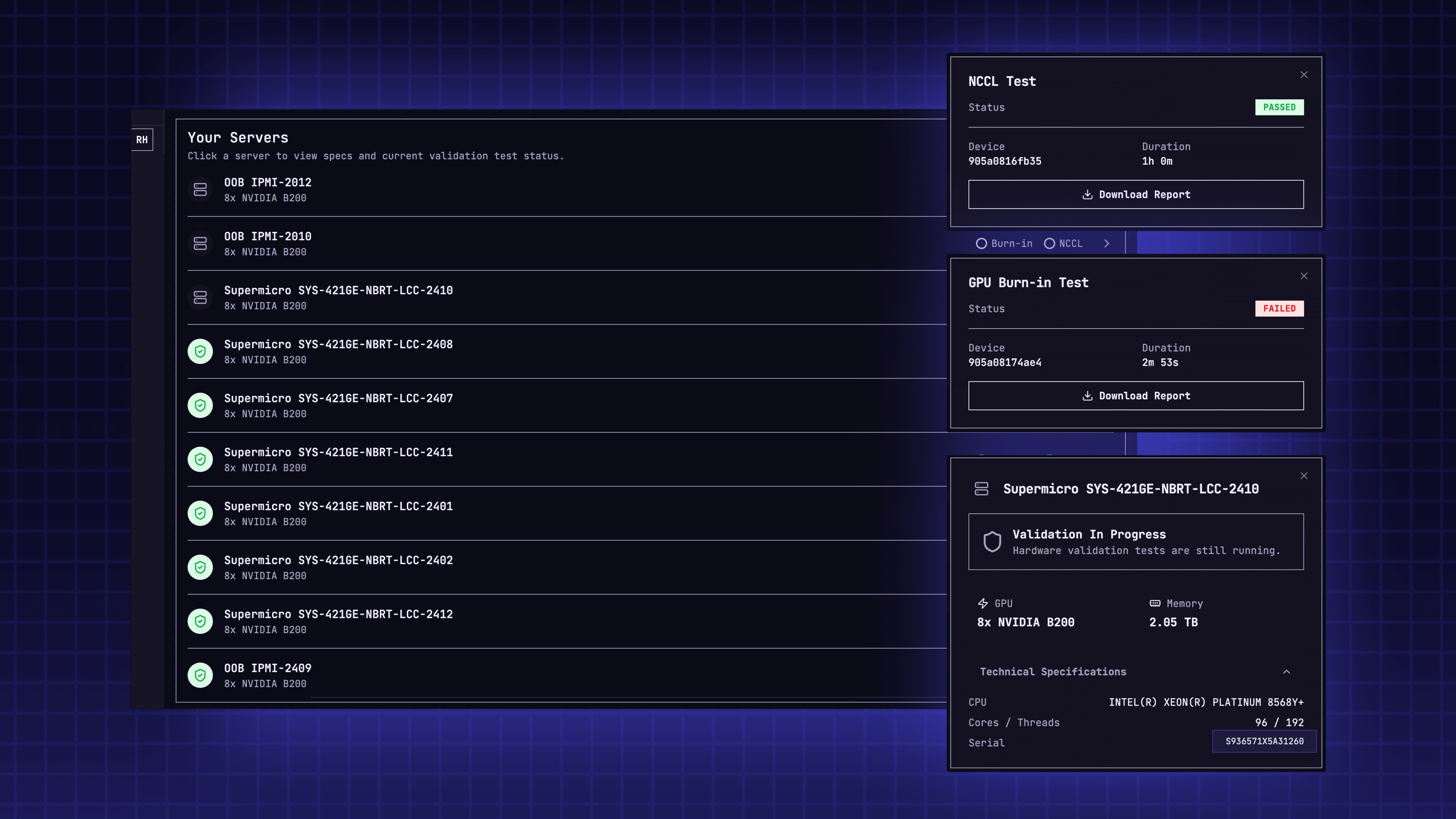 Device health goes beyond confirming a server exists. Lenders see technical specs, burn-in test results, and full diagnostic health check history for each server. Initial qualification results and ongoing health trends are both visible. This is the difference between knowing a server is present and knowing it is performing to spec.