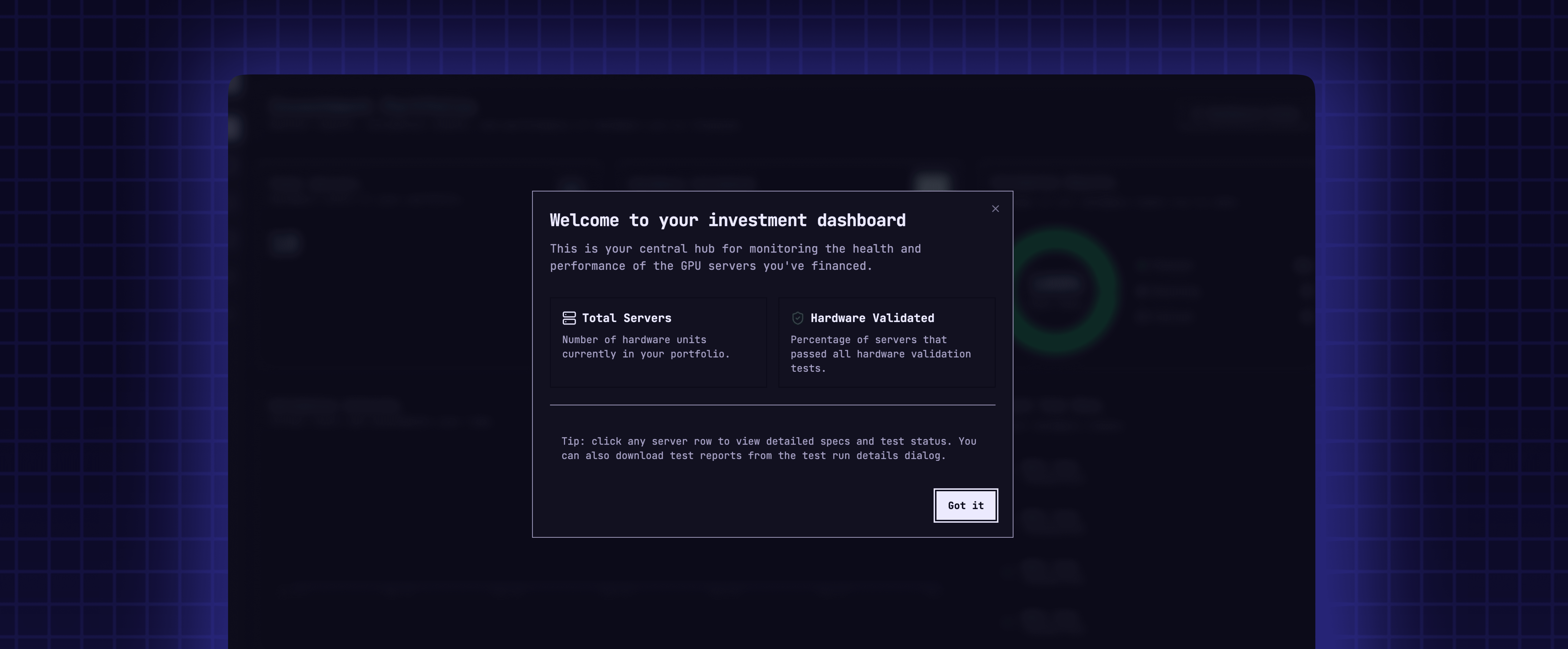 For lenders, that means self-service verification replaces email chains and spreadsheets. Open the portal, confirm your financed servers are connected, check health diagnostics, and see whether they are generating revenue. No request to the operator required.
